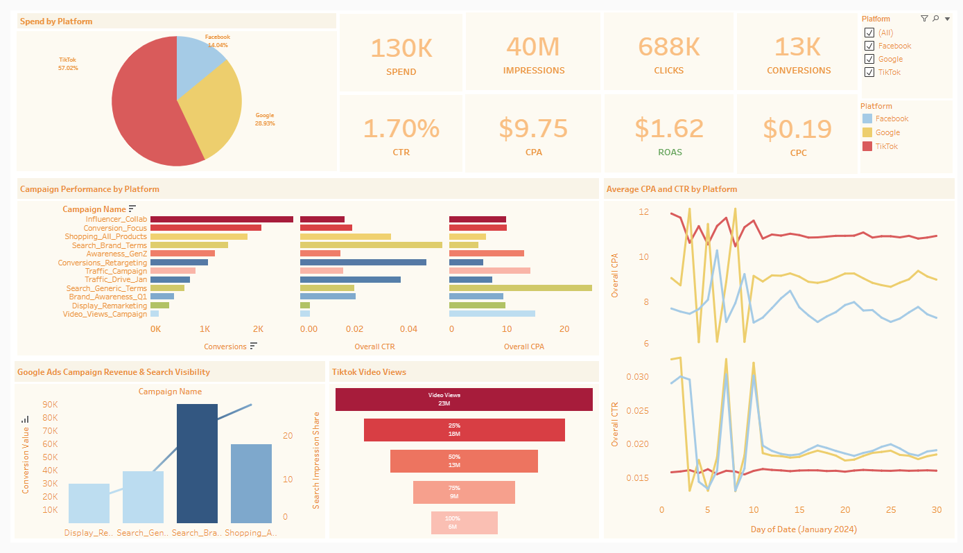 This project integrates Facebook, Google Ads, and TikTok advertising data into a unified cloud data model to deliver executive-level cross-channel performance insights.